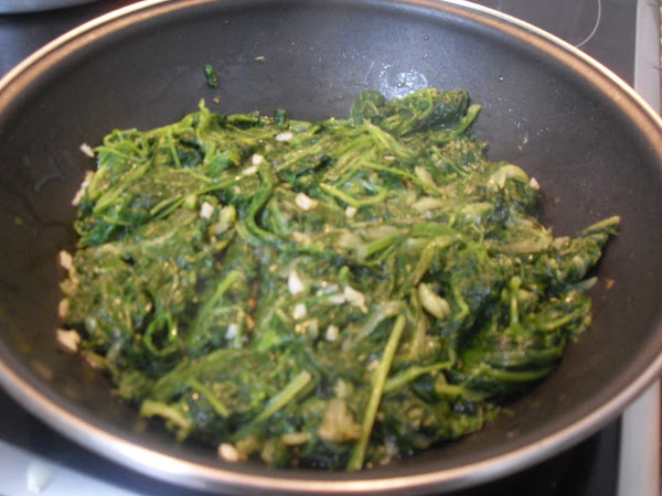 Elaboración:Lavar bien y cortas las espinacas. Cocer cinco minutos, colar y saltearlas con la cucharada de aceite y los ajos picados, durante 3 o 4 minutos. Sazonar, apartar y reservar.