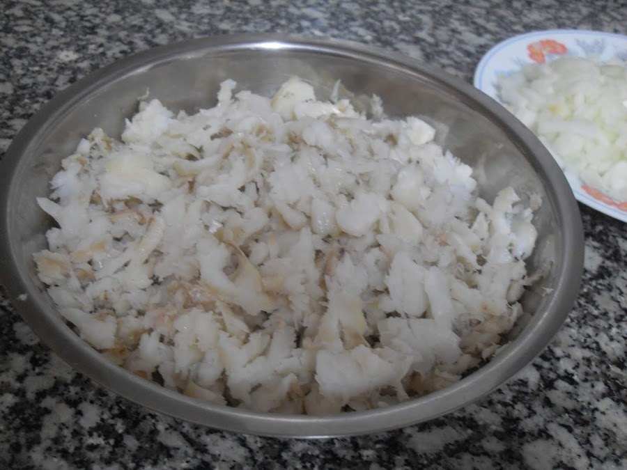 Saltear los lomos de merluza, por los dos lados, añadir el vino blanco cocinar un par de minutos y salpimentar. Desmigar, quitando la piel y alguna posible espina, mezclar en un bol con el sofrito de tomate y la cebolla pochada, reservar.