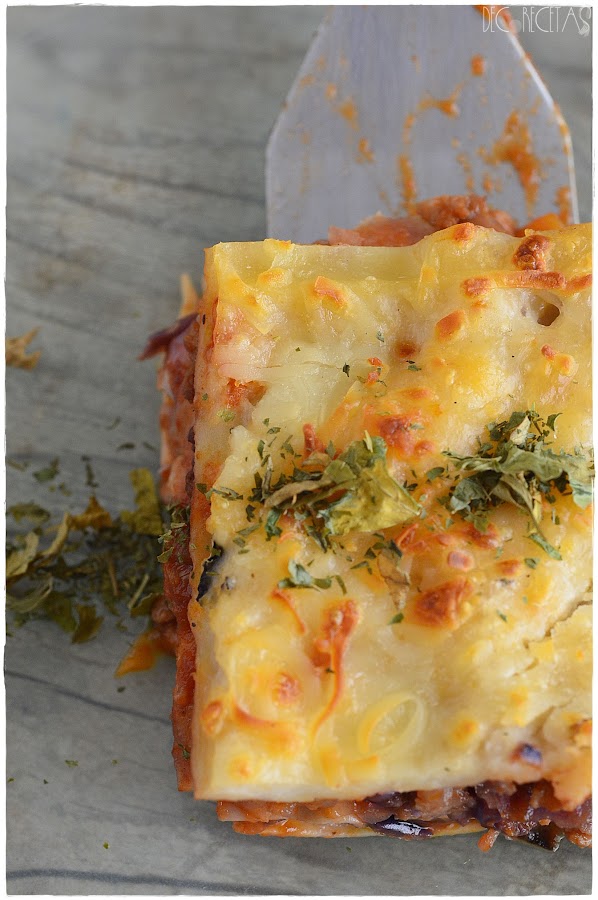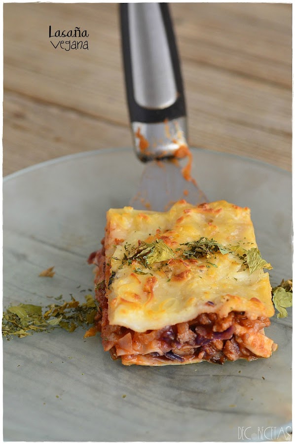 Realice el relleno igual que en la receta que os comento en el principio de esta entrada, pochando media cebolla junto con una zanahoria. En ese punto añado 150 gramos de soja texturizada con medio bote de tomate triturado. Añado agua si veo necesario que la soja necesito más hidratación. Montamos la lasaña cómo se hace habitualmente, intercalando placas de pasta con el relleno vegano. Por último una capa de bechamel espesa y queso rallado que llevaremos al horno gratinando en último lugar