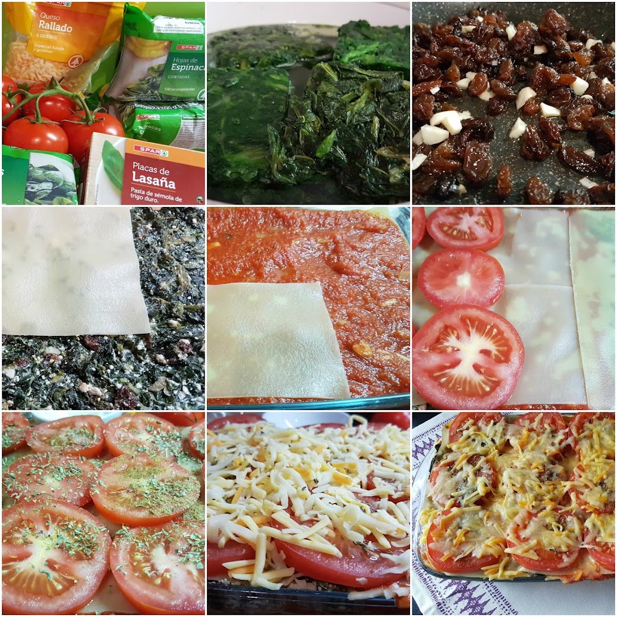Lasaña vegetal, elaboración:1.- Cocemos las espinacas con agua, la hoja de laurel y sal durante 10 minutos. La escurrimos bien. En una sartén grande añadimos unas cucharadas de aceite de oliva, sofreímos los dientes de ajo picados. Añadimos las uvas pasas y sofreímos 2 minutos más. Agregamos las espinacas y lo mezclamos todo bien. Por último añadimos el requesón y lo integramos bien con el resto de los ingredientes. Retiramos del fuego y reservamos.