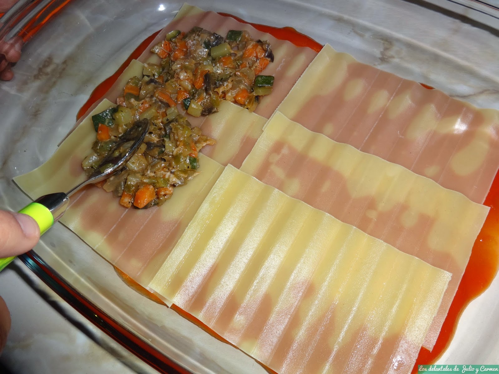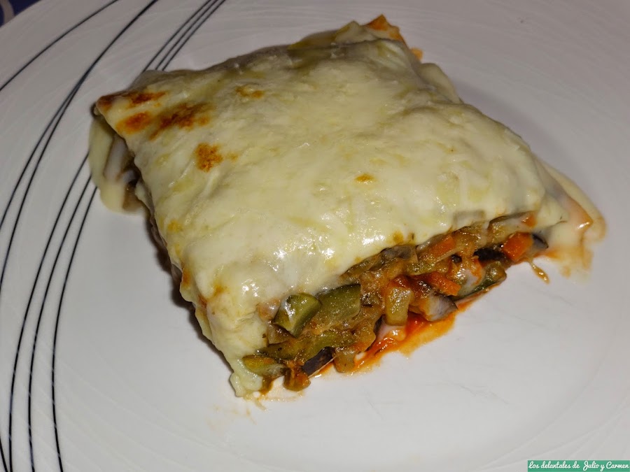 Nos decantamos por hacerla así. La preparación no fue nada complicada, ya que era un sofrito con verduras, pero lo que mas nos llamaba la atención (y lo que mas nos preocupaba que nos saliera bien) era el montaje final. Sinceramente, no se por que estábamos preocupados por este paso, ya que es bastante mas sencillo y fácil que los canelones: estos son mas "difíciles" al tener que hacerlos uno a uno. Sin embargo, la lasaña es bastante mas fácil y su montaje es simplemente ir formando capas: una capa de pasta, otra de relleno, otra de pasta... y así hasta completar los ingredientes que tengamos.