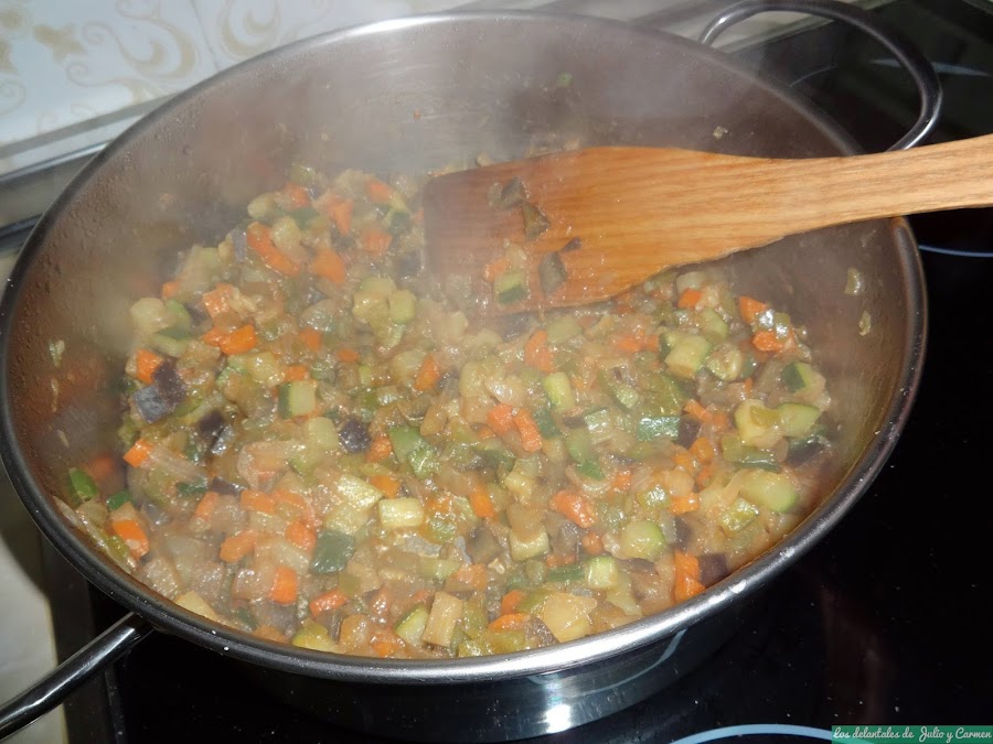 Comenzaremos preparando las verduras. Las lavamos bien y las partimos en trozos pequeños, tanto el calabacin, las zanahorias (después de pelarlas), los pimientos y la media cebolla. La berenjena, la lavamos y cortamos en rodajas, dejándolas en un colador con un poco de sal para quitarles un poco el amargor. Tras unos minutos así, las lavamos de nuevo y las cortaremos también en trozos pequeños.