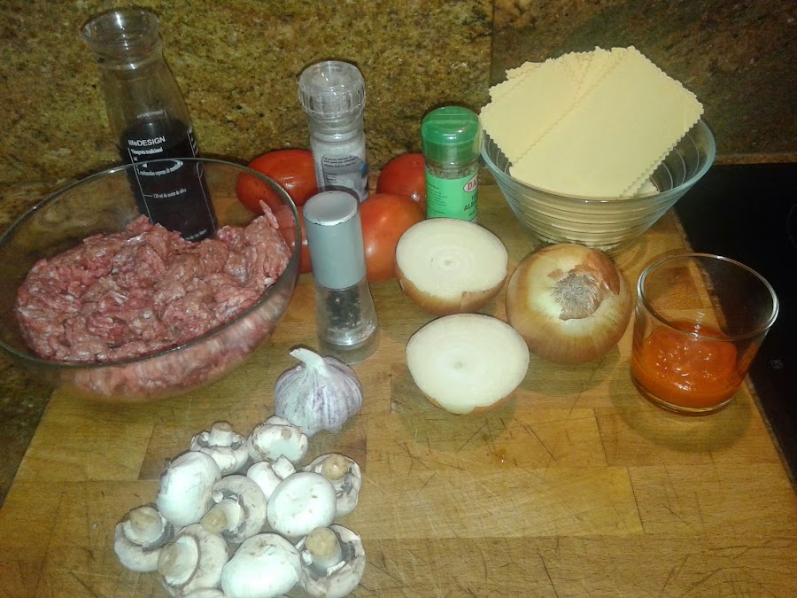 18 placas de lasaña, 2 cebollas picadas,2 dientes de ajo, 1 kg de carne picada ( mitad ternera, mitad cerdo),500 g de tomates pelados y picados, 2 cucharadas de tomate frito, 125 ml de vino tinto, 200 g de champiñones picados o laminados, 2 cucharaditas de albahaca seca, aceite de oliva, sal y pimienta negra molida.