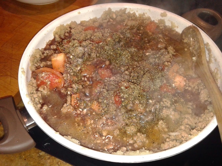 Una vez la carne se haya dorado, echaremos el resto de ingredientes, el tomate pelado y picado, los champiñones fileteados o picados (yo los he puesto picados), la albahaca, el vino tinto y salpimentaremos.