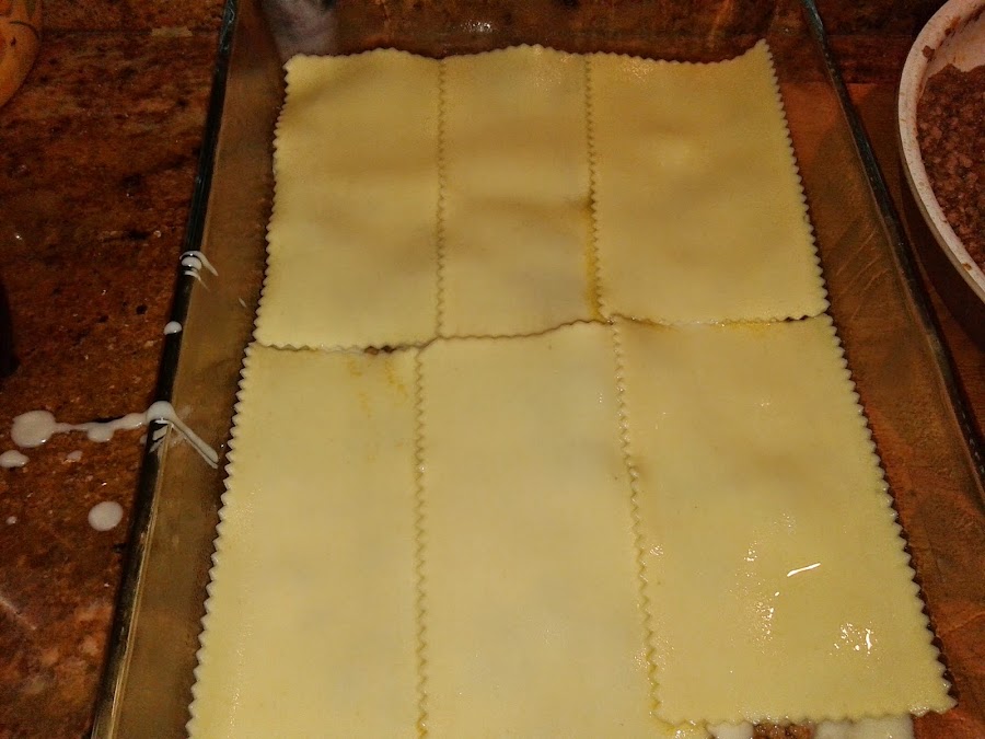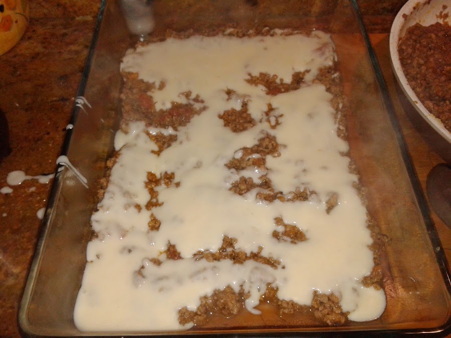 Cubrimos la capa de carne con una de pasta y de nuevo con otra de carne y bechamel.