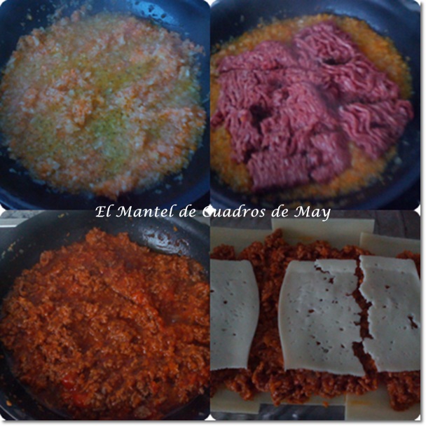 Yo pongo primero un poco de bechamel, encima las láminas de la lasaña, una capa de relleno de la carne, otra de láminas de queso, como veis en la foto las parto por la mitad; una cucharada de bechamel. Y volvemos a empezar con las láminas de lasaña.