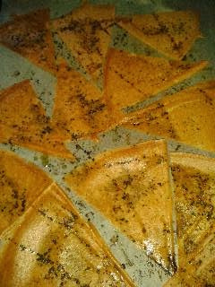 Cortamos las obleas en 8 partes iguales y disponemos, en una capa, sobre una fuente de horno forrada con papel vegetal. Pincelamos con aceite de oliva.
