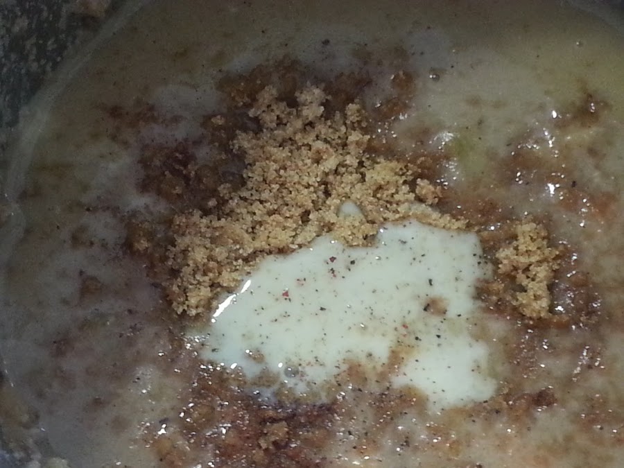 5. - Le añadimos la leche, la nuez moscada, la pimienta y las pastillas de caldo y lo dejamos 5 minutillos más.