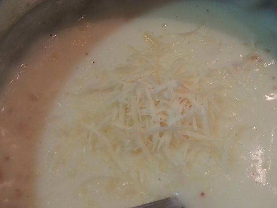 7. - Mientras hacemos una bechamel clarita, cada uno a su gusto. Yo la hago con 2 cucharadas de harina de maíz, medio litro de leche, sal una cucharada de margarina salada y le añado al final un poco de queso parmesano rallado.