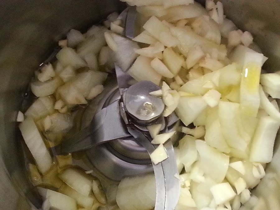 1. - Ponemos a sofreír 10 minutos el aceite con la cebolla y el ajo.