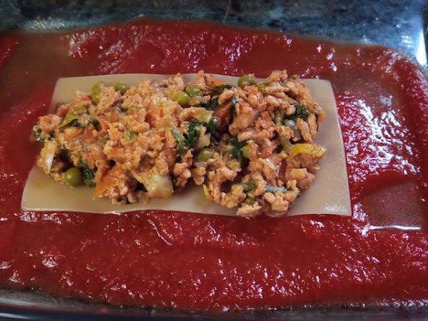 Ahora coloca la primera placa de lasaña y encima una capa de relleno.
