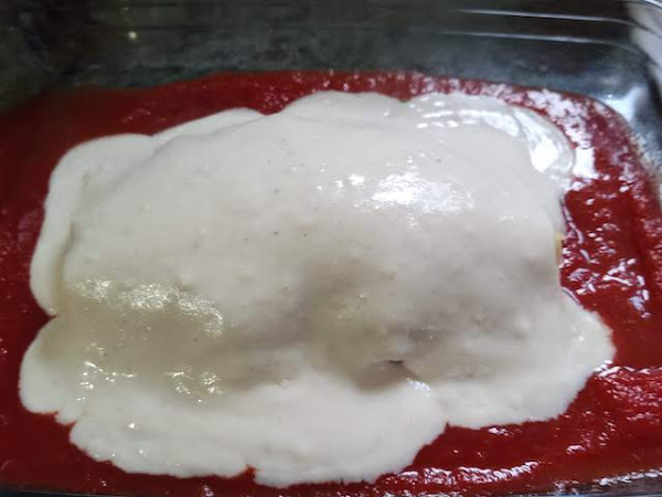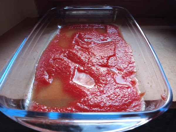 Primero coloca salsa de tomate como base, en una bandeja para el horno.