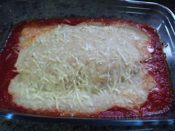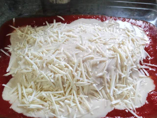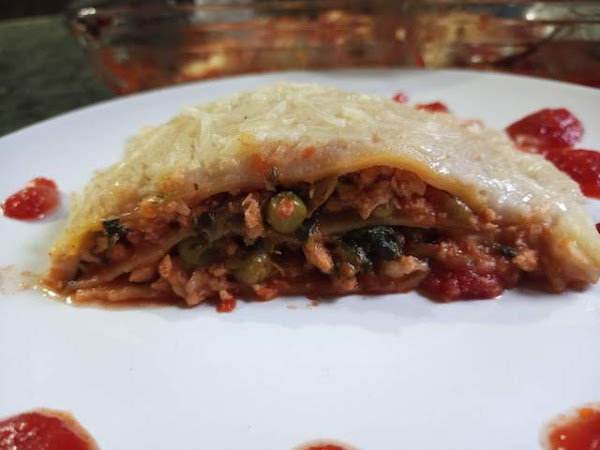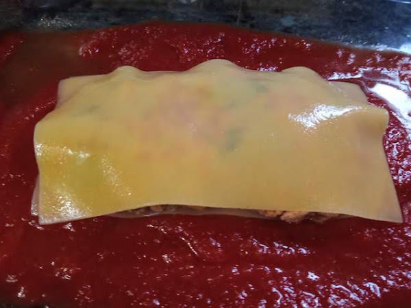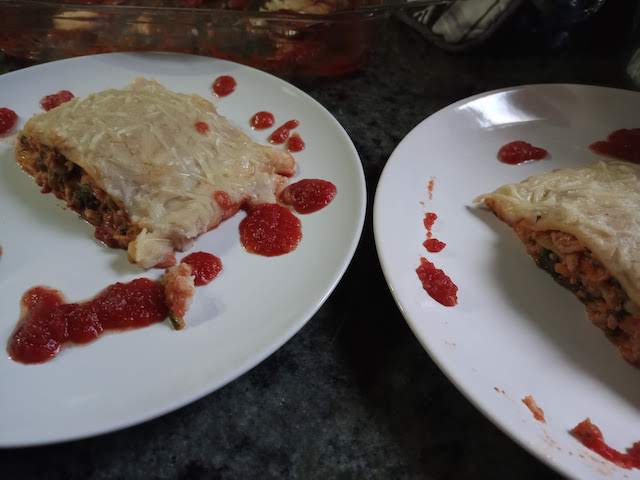 La segunda placa de lasaña, una nueva capa de relleno y la última placa.