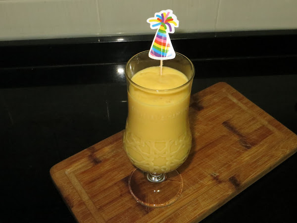 Se pela el mango y se echa en el vaso de la batidora junto con el yogur la leche y los hielos y se bate todo. Si veis que queda muy líquido le podéis añadir algo más de mango y si queda muy espeso más leche.