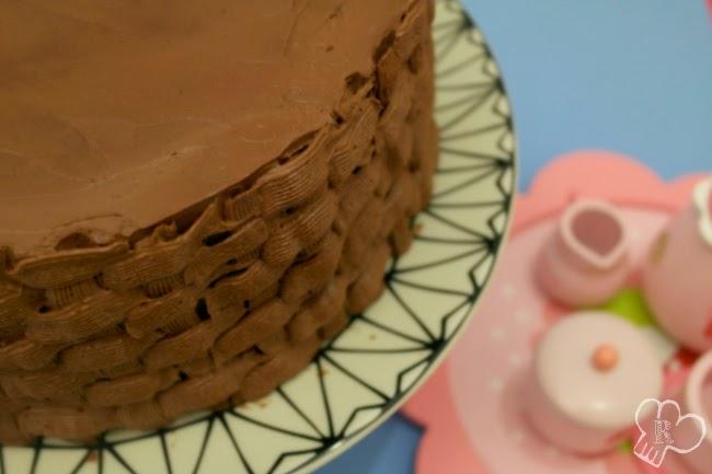 Finalmente con la crema que nos quede llenamos una manga pastelera con una boquilla tipo 47 de wilton y vamos decorándola como si fuera una cesta de mimbre uniforme. Se hace dibujando una tira de crema en vertical y varias tiritas transversales por encima de la vertical separándolas 1 cm, continuamos con otra tira vertical mas o menos a 1 cm de separación y nuevamente tiras transversales pero estas alternas a la tira anterior y así sucesivamente hasta cubrir todo el lateral de la tarta.
