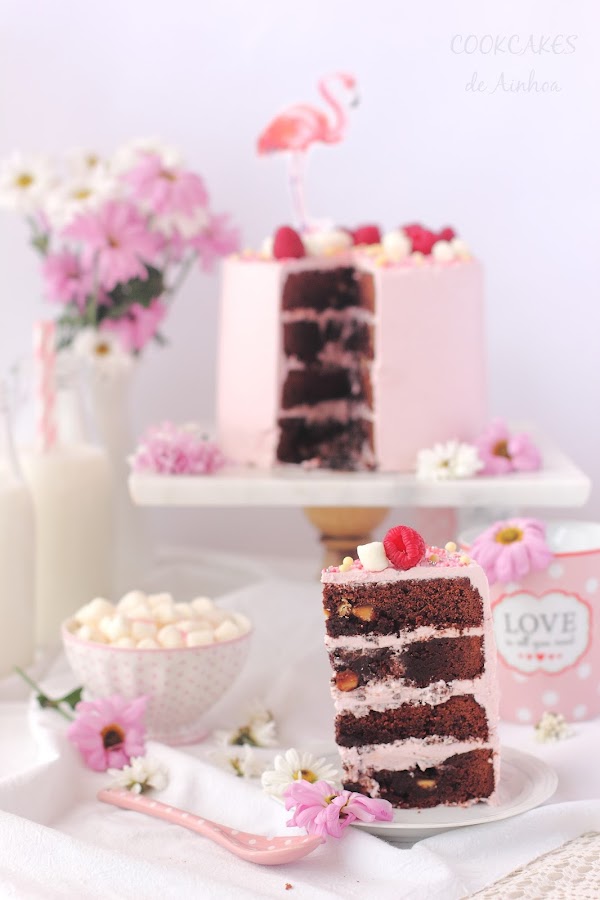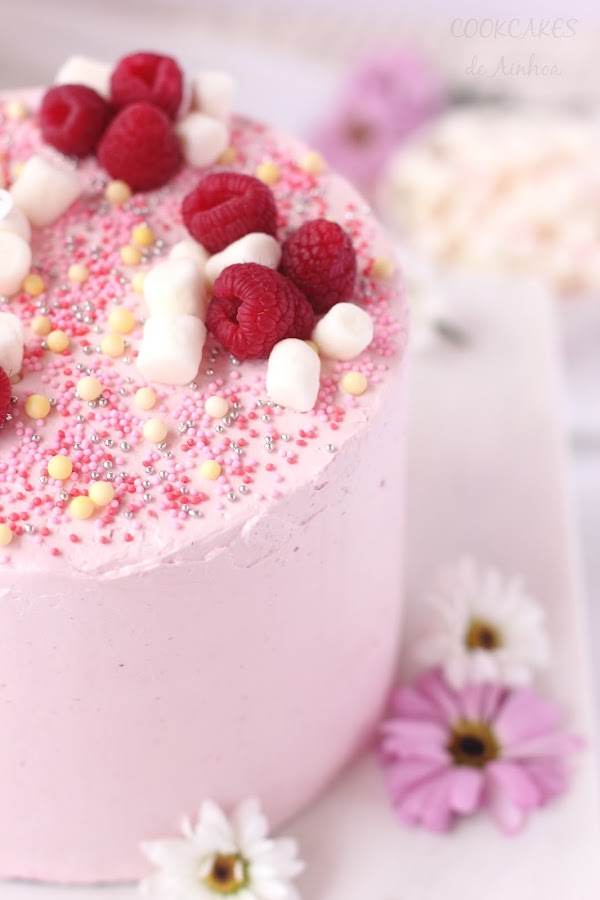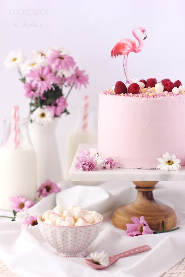 Decoramos la tarta, al gusto. En mi caso he usado sprinkles, nubes y frambuesas frescas, junto a un topper de flamenco.
