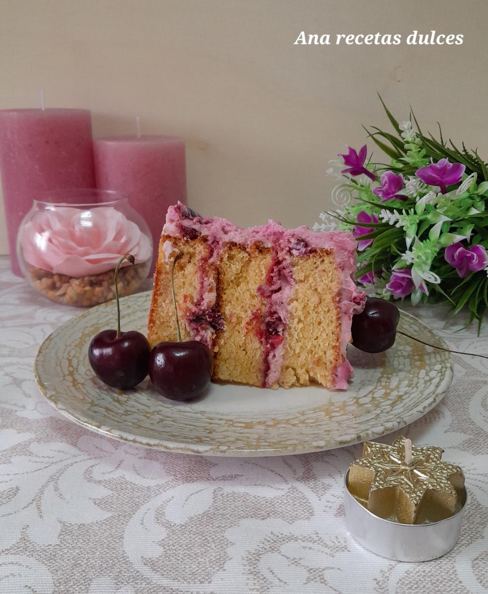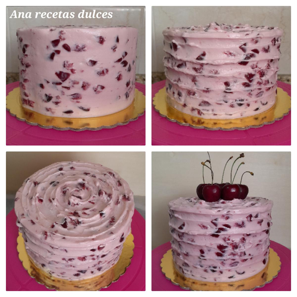 Ponemos el primer bizcocho en el plato o stand donde la vamos a servir, metemos el frosting de cerezas en una manga pastelera y rodeamos el borde de la tarta, rellenamos el centro con la confitura de cerezas y cubrimos la confitura con el frosting.