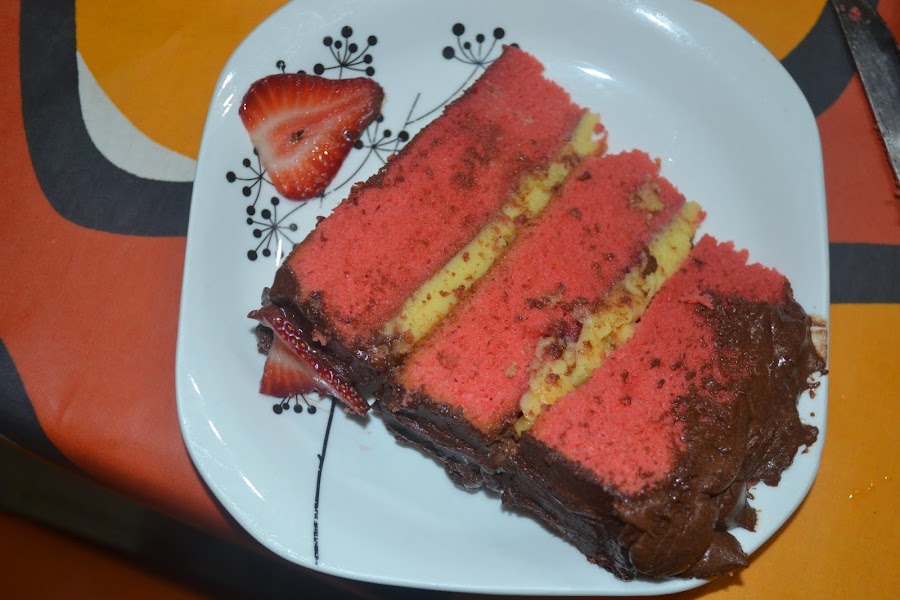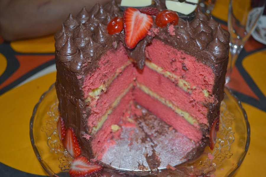 Le puse las fresas para darle un toque de color, y para acompañar la mermelada de fresa que lleva la tarta por dentro. También le puse colorante rojo, pero no os lo recomiendo porque este bizcocho se reseca bastante con el colorante, aunque sigue estando muy bueno.