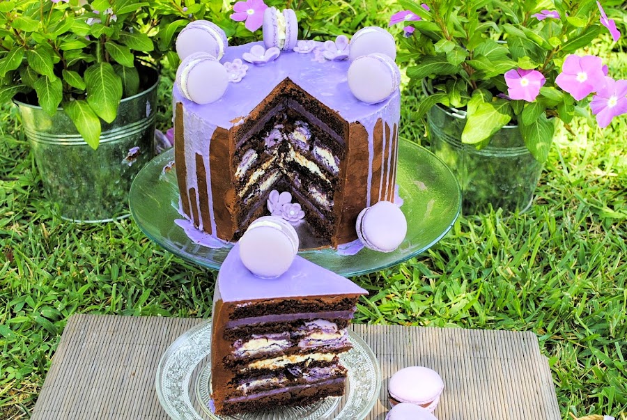 Ponemos otra capa de ganache y macarons presionamos bien y cubrimos con la 5 capa de bizcocho añadimos ganache y buttercream de violeta.