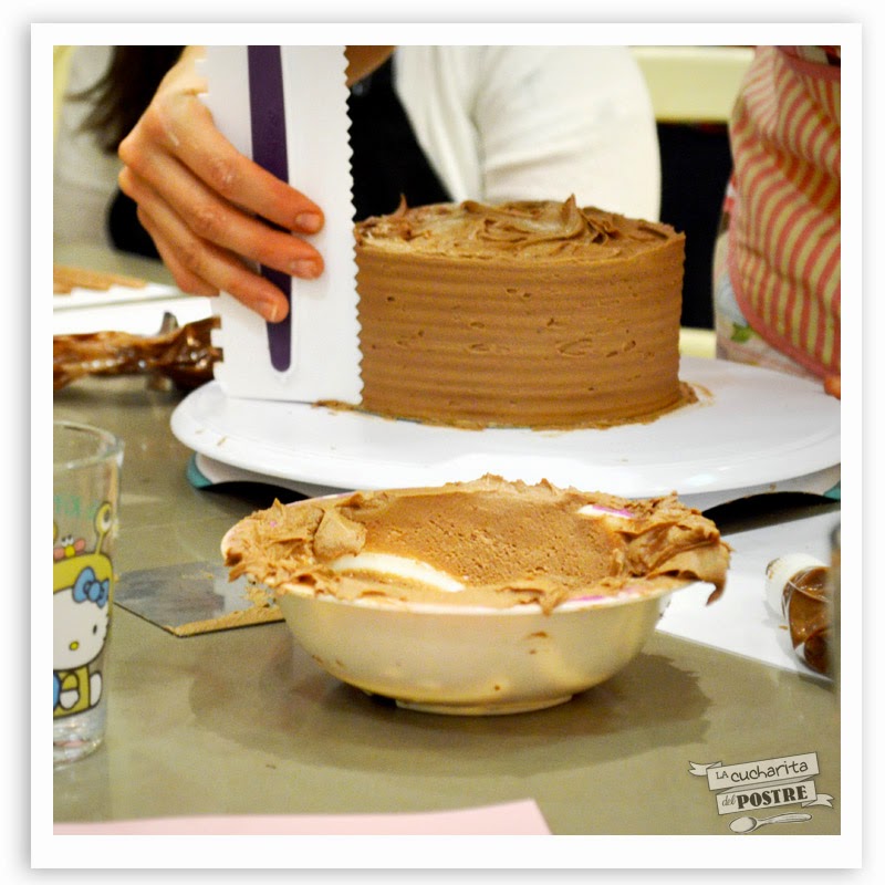 Una de las partes más divertidas del curso fue aprender nuevas técnicas de decoración con manga, espátulas, conseguir un alisado perfecto... Yo opté por una tarta lisa con adornos con manga.