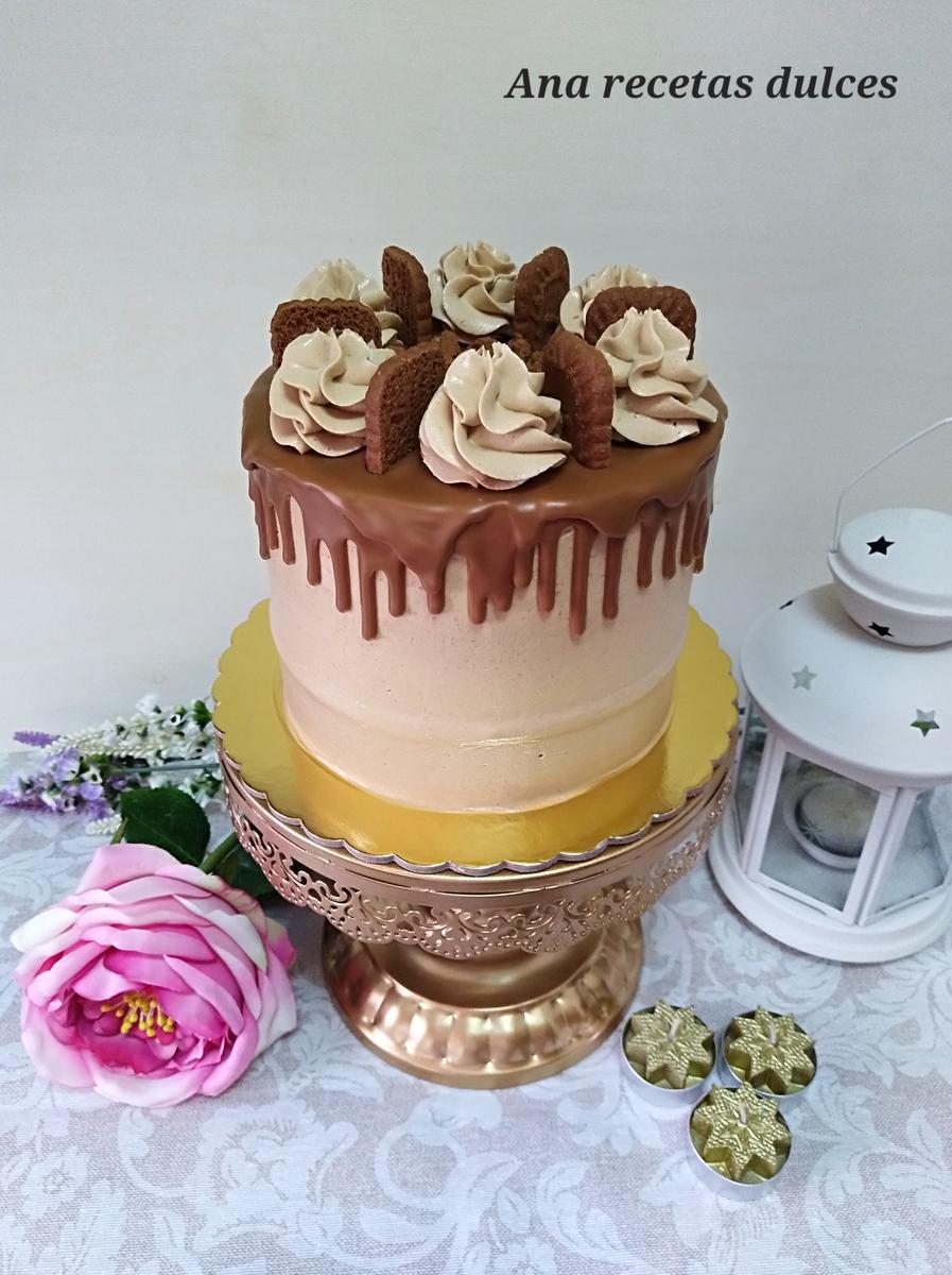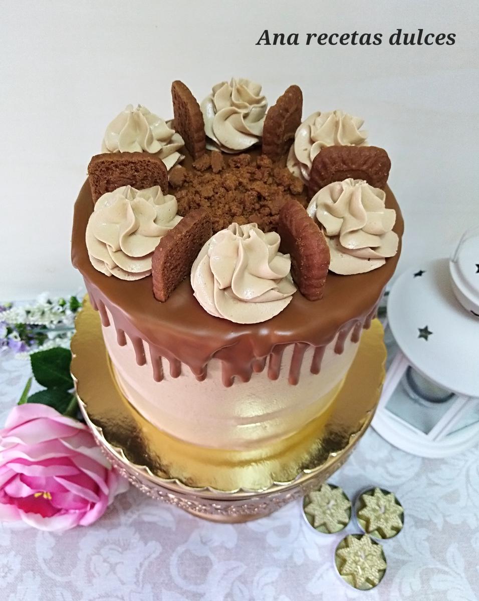Introducimos el resto de la buttercream en una manga pastelera con una boquilla (yo he usado la 2D de Wilton), hacemos copetes por todo el borde de la tarta y entre copete y copete ponemos medias galletas lotus y terminamos esparciendo galletas lotus desmenuzadas por toda la superficie de la tarta.