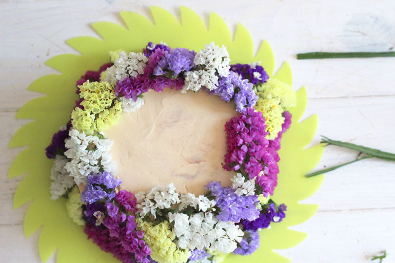 Un vez tengáis la corona hecha veréis que os quedan huecos, no hay problema, cortar flores individuales y tapar las huecos, no se verá que nos es parte del ramillete y hará que el acabado de la tarta sea perfecto.