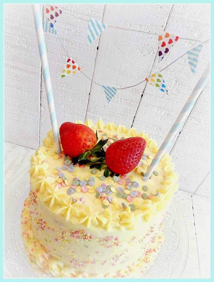 Para finalizar decoré con unos confetti de colores en la parte superior de la tarta y unas perlitas de colores por los laterales y le añadí unas guirnaldas hechas con unas cañitas de colores y whasi tappe y un par de hermosos fresones.