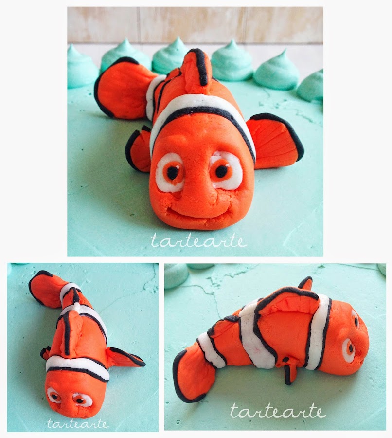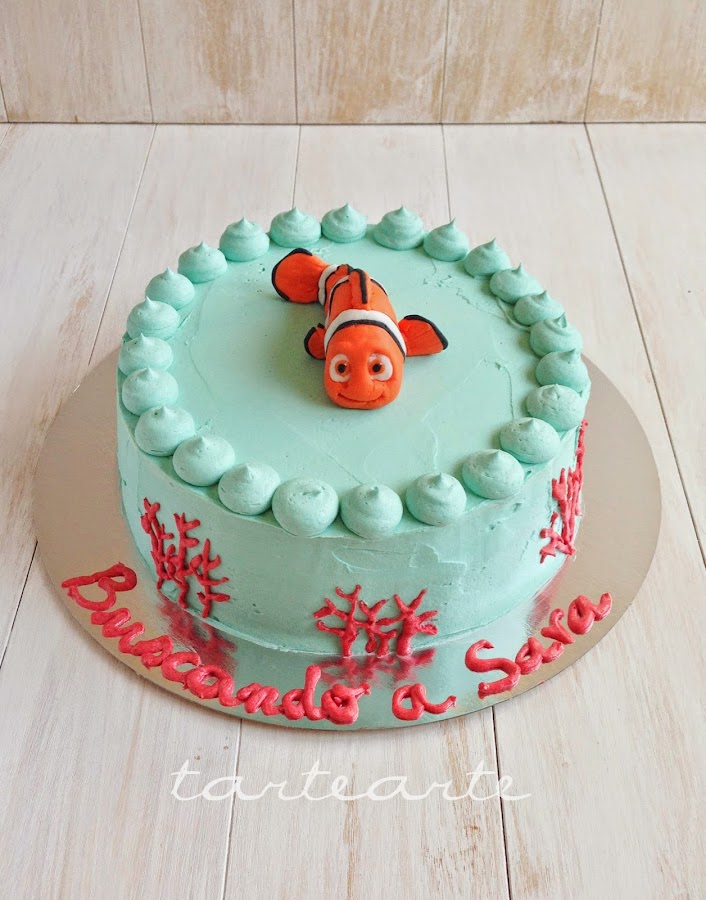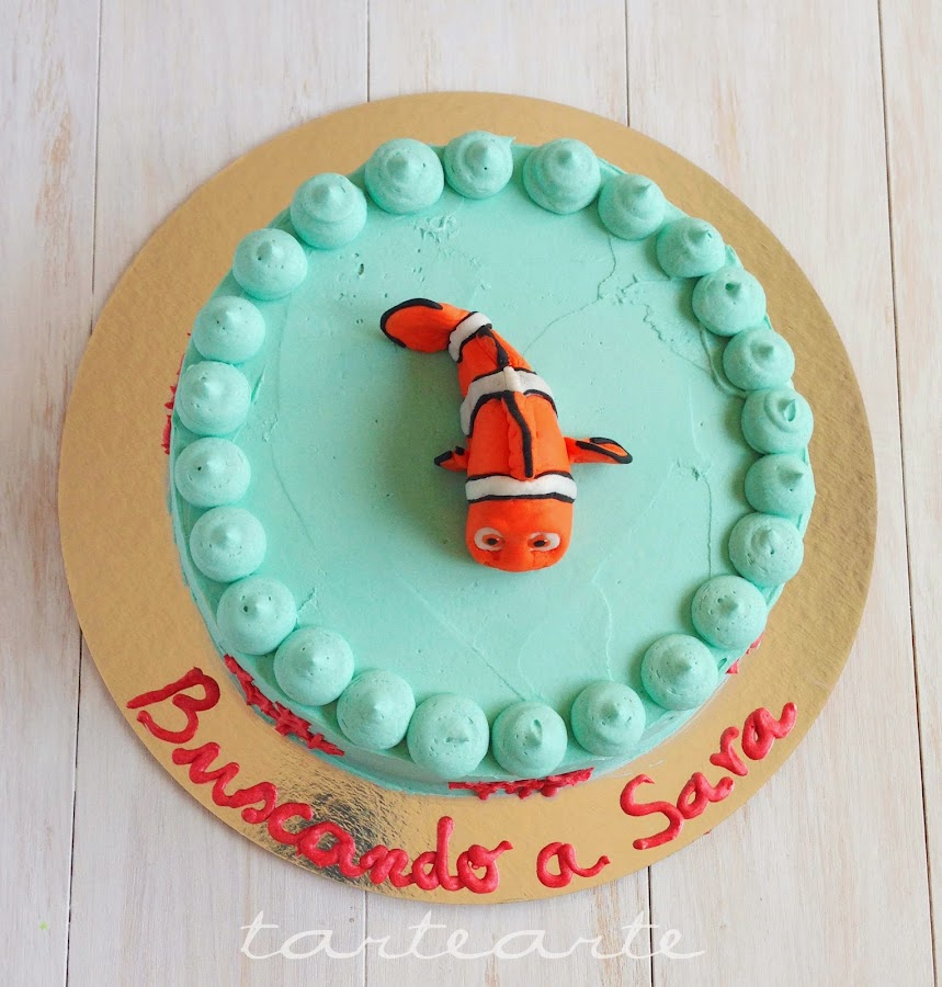 Quería una tarta que llevara un modelado de nemo, porque le gusta mucho esa peli (a mi también!!) y que pusiera "Buscando a Sara". Me encanto ese detalle!! Es súper original.