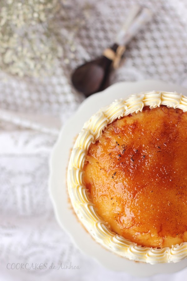 Para elaborarla, me base en diferentes recetas de grandísimas reposteras: para el bizcocho de vainilla usé la receta del libro Pasteles de Martha Stewart; para la trufa usé una receta de Ivana Muntán de Cupcakes a diario; para la crema "sara" usé la de El secreto endulzado; y, finalmente, para la yema tostada de En la cocina de Caro.Layer cake de vainilla, trufa, sara y yema tostada