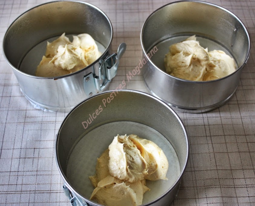 Repartir la mezcla en los 3 moldes (yo lo hago con la ayuda de una cuchara para helados para que me queden la mezcla repartida por igual)