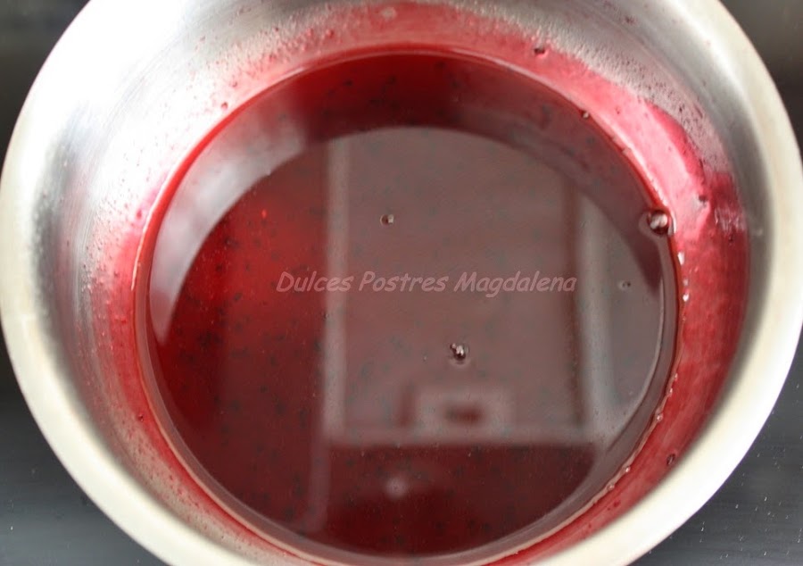 En un cazo, echar el agua y el azúcar, llevar a ebullición, una vez rompa a hervir, retirar y añadir la pasta de frambuesa, reservar.