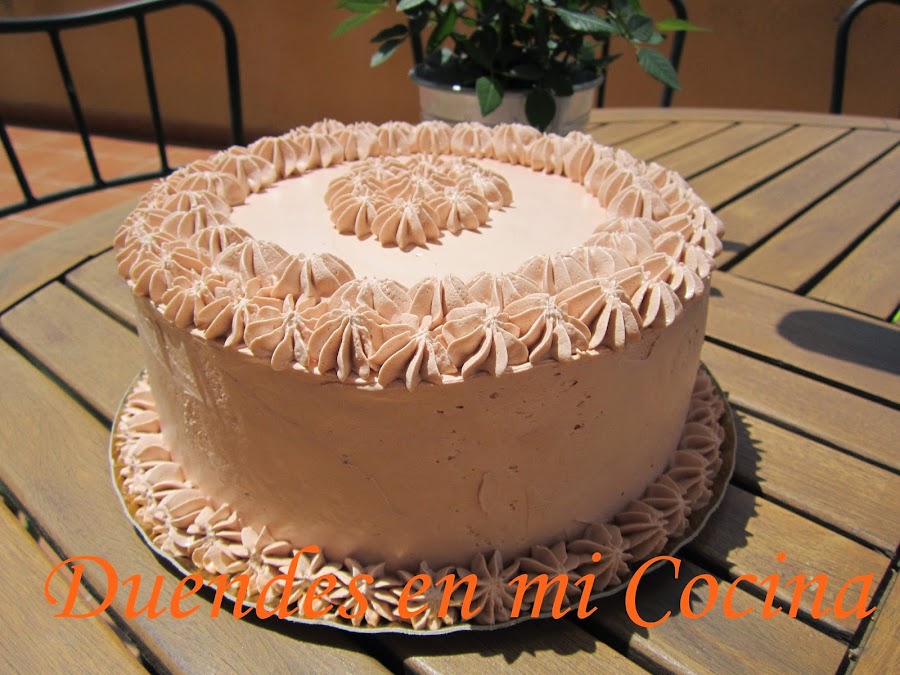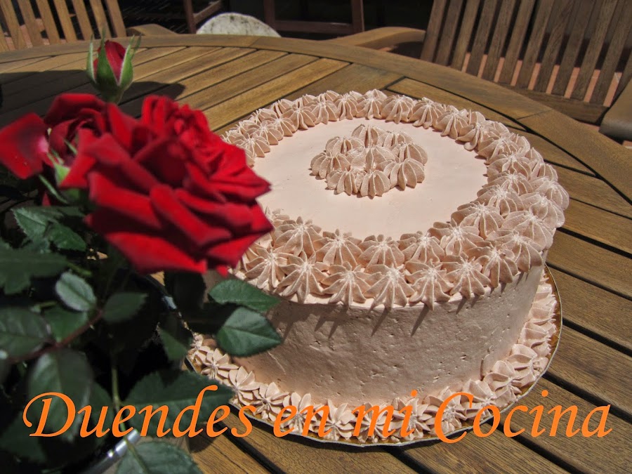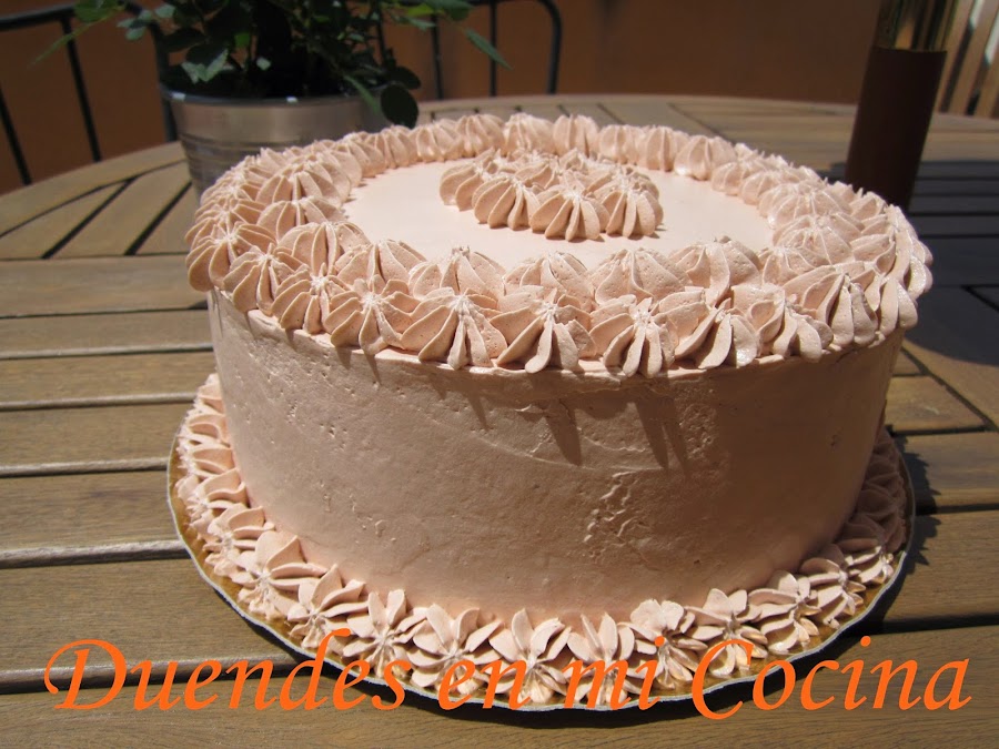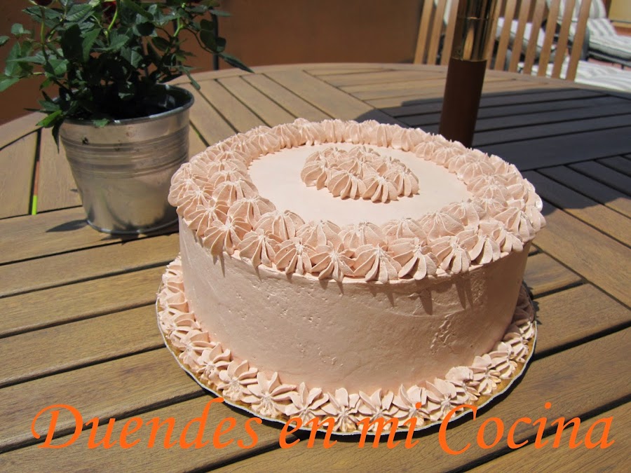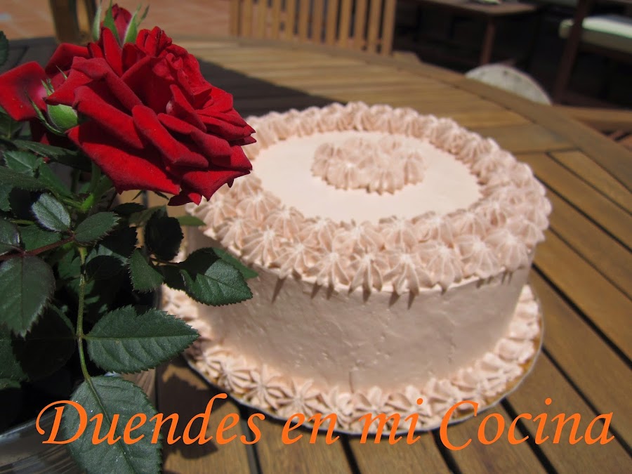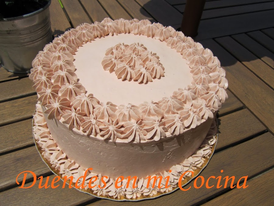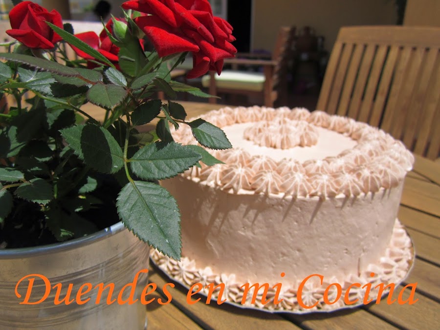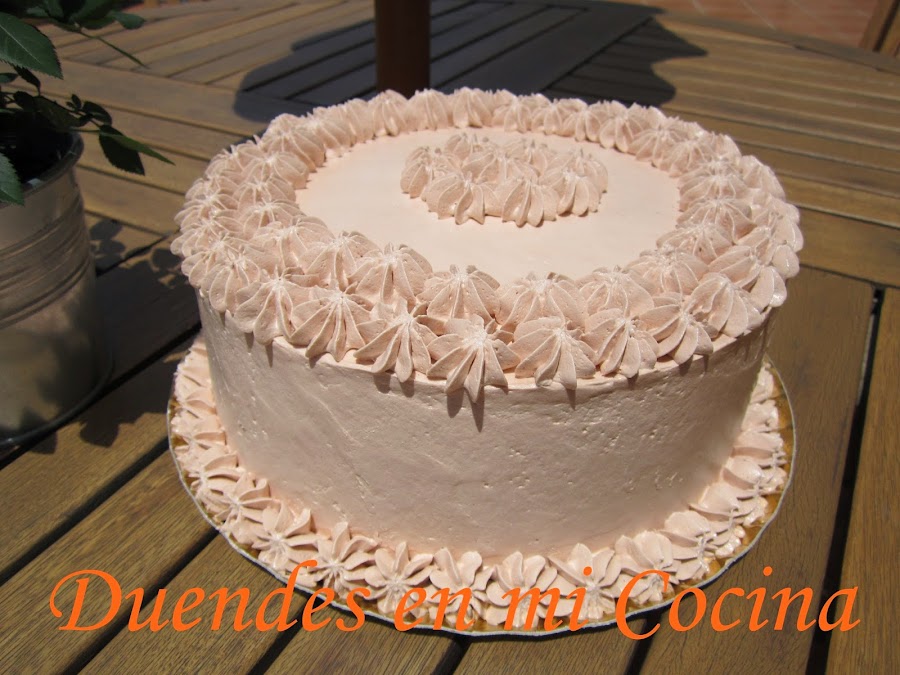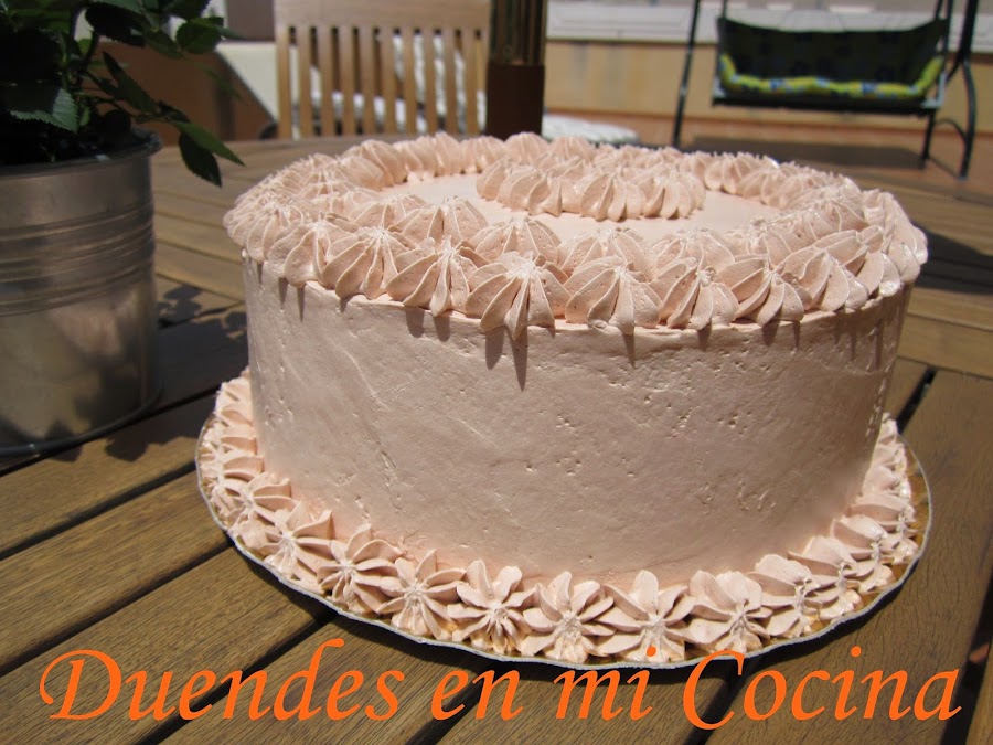 Esta tarta es una layer de bizcocho de chocolate con almíbar de fresa y rellena y cubierta con una crema de vainilla y fresa, no os digo más, de escándalo.