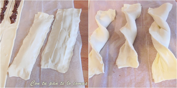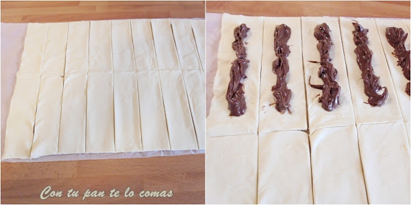 2. Poner la crema de cacao en la mitad de las tiras de hojaldre dejando un buen espacio alrededor para unirlos con las otras tiras.