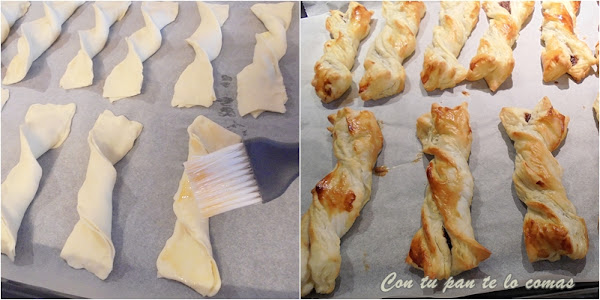 6. Calienta el horno a 190º (función ventilador) y mete la bandeja cuando esté caliente. Tardarán en hacerse entre 12 y 15 minutos, hasta que estén un poco dorados y el hojaldre haya subido.