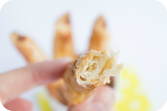 Retorcemos cada tira individualmente y ponemos sobre la bandeja del horno a la que le pondremos papel vegetal para que no se peguen.