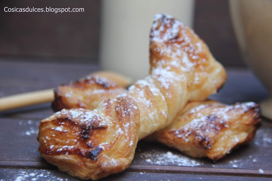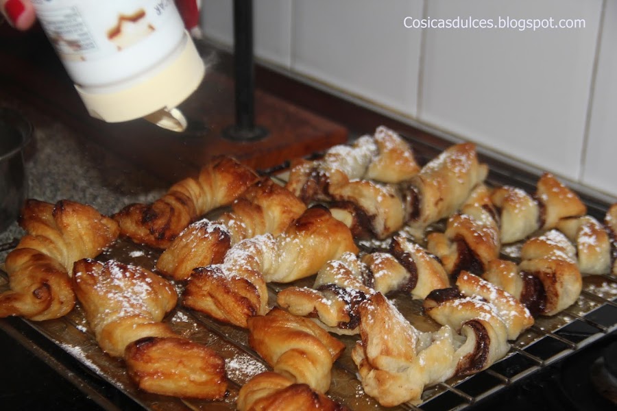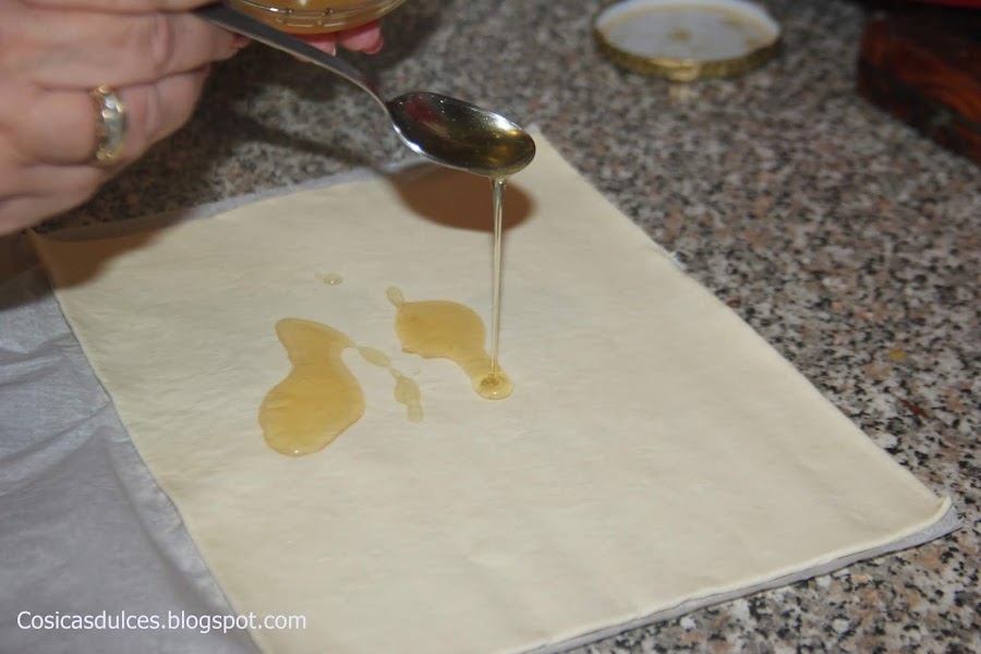 Estiramos una de las láminas de hojaldre y la pincelamos con miel o con crema de cacao, según nuestro gusto.