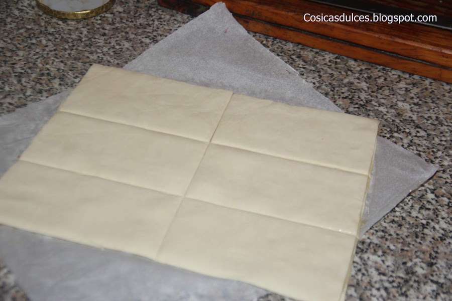 Colocamos encima la otra lámina de hojaldre,presionando para que se quede bien pegadita y cortamos un rectángulos. Yo hice doce pero me salieron bastante grandes así que si los preferís más pequeños cortadlos en más porciones.