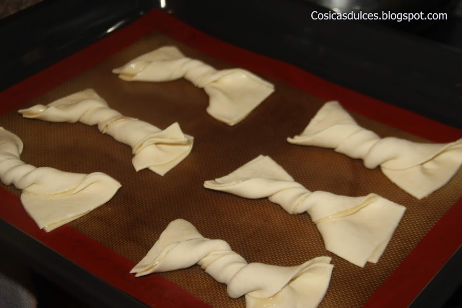 Le damos forma de lazo retorciéndoles por el centro y los colocamos en la bandeja de horno.