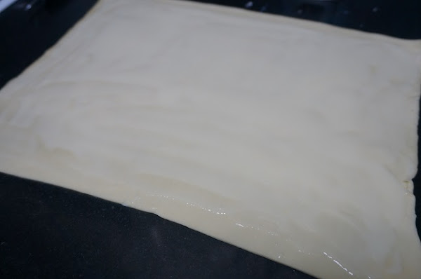 Estiramos la masa de hojaldre y con una brocha pintamos toda la masa con leche condensada, pondremos una capa fina.