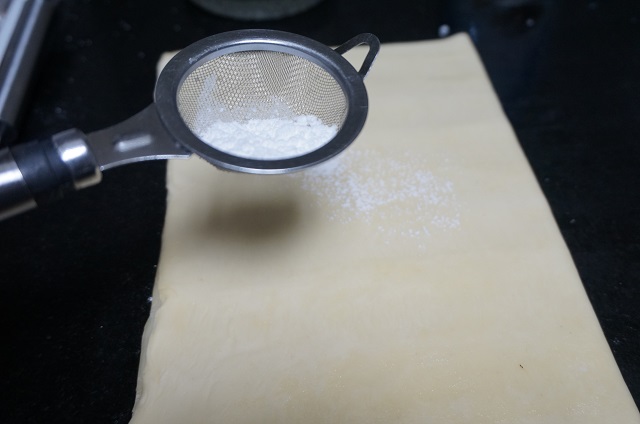 Doblamos el hojaldre, o si tenéis dos hojas de hojaldre, pondremos una encima. Espolvoreamos un poco de azúcar glas, esto es opcional.