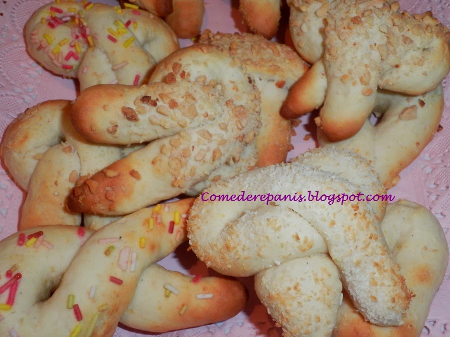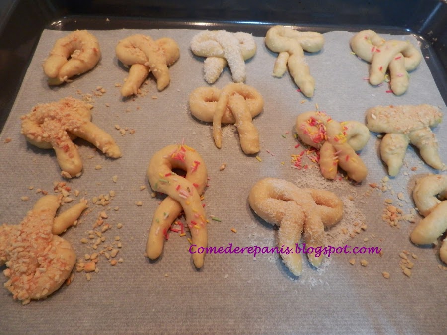 Colocamos todos nuestros lazos en una bandeja de horno y los espolvoreamos con lo que mas os guste, en mi caso he hecho unos con almendras, con coco y otros con sprinkles de colores.