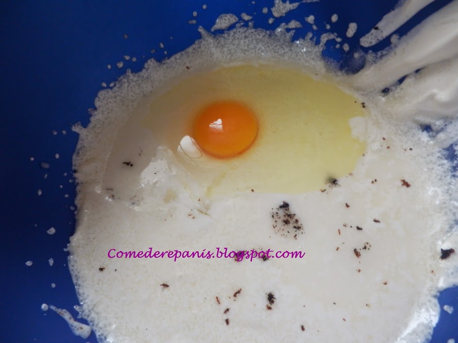 Para empezar es importante mezclar los ingredientes húmedos con la vainilla, es decir, la nata (crema de leche), el huevo, el licor y las semillas del interior de la vaina de vainilla. ¿Porqué os pido vainas de vainilla? Es muy sencillo, es la mejor forma de conseguir el auténtico aroma, sin artificiales. Además es muy fácil de hacer, le hacemos un corte a la vaina de arriba a abajo y luego con la punta del cuchillo raspamos las semillas, es sorprendente el olor tan agradable y nada excesivo de las semillitas.
