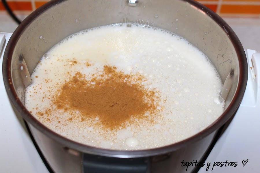 Añadimos la leche y la canela y volvemos a batir 15 segundos a velocidad 5. Este proceso lo podemos hacer con una batidora eléctrica también.