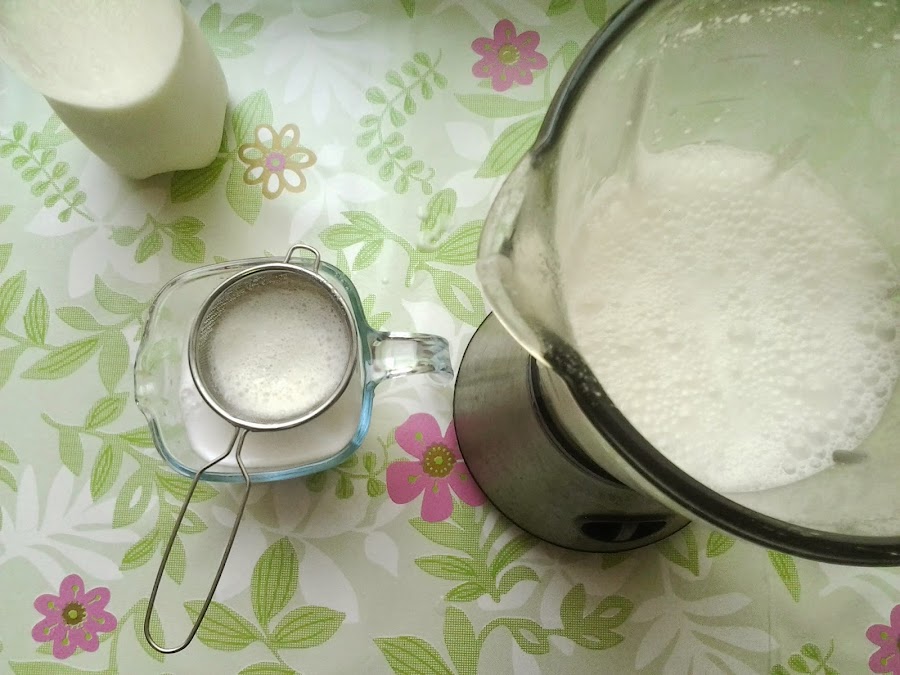 Bátelas bien, hasta que queden sólo granulitos de almendra y el agua se haya coloreado totalmente de blanco.