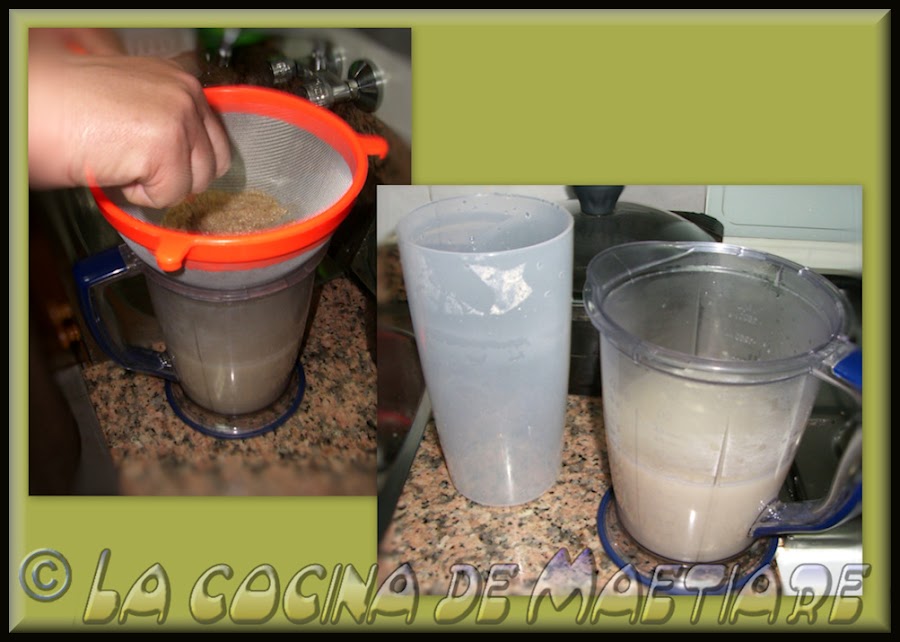 Limpiamos bien el colador bajo el grifo del agua corriente y volvemos a filtrar ya en el recipiente donde lo vamos a guardar, en mi caso es el mismo donde lo he batido ya que tiene tapa, pero lo puedes guardar en una botella de cristal por ejemplo. Todo éste lío del filtrado te lo evitas con la chufamix que es mucho más práctica y para la emulsión de las leches vegetales también es mejor .