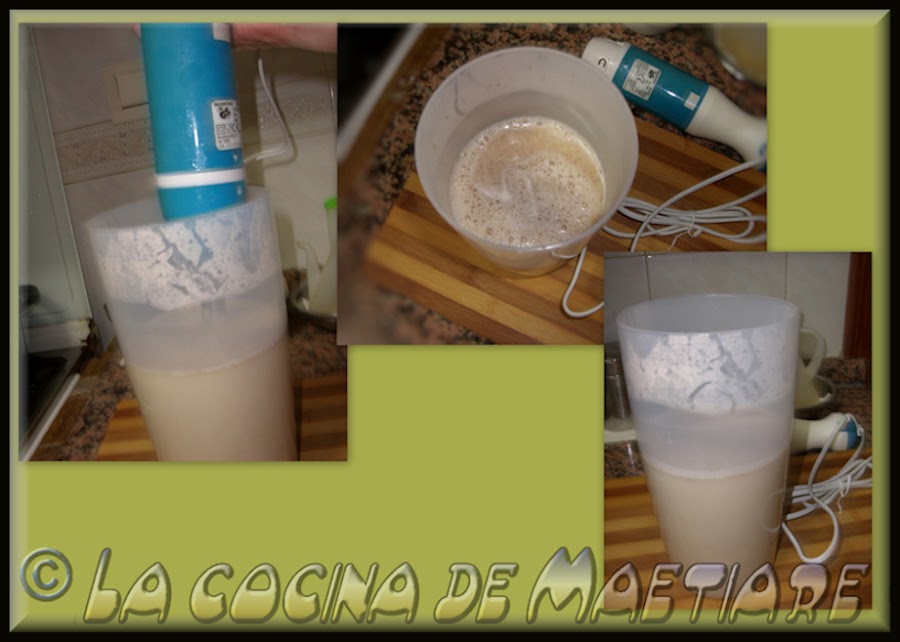Introducir batidora de mano y batir arriba y abajo sobre 1 minuto o 1 minuto y medio, se tiene que formar un poco de espumilla en la superficie.
