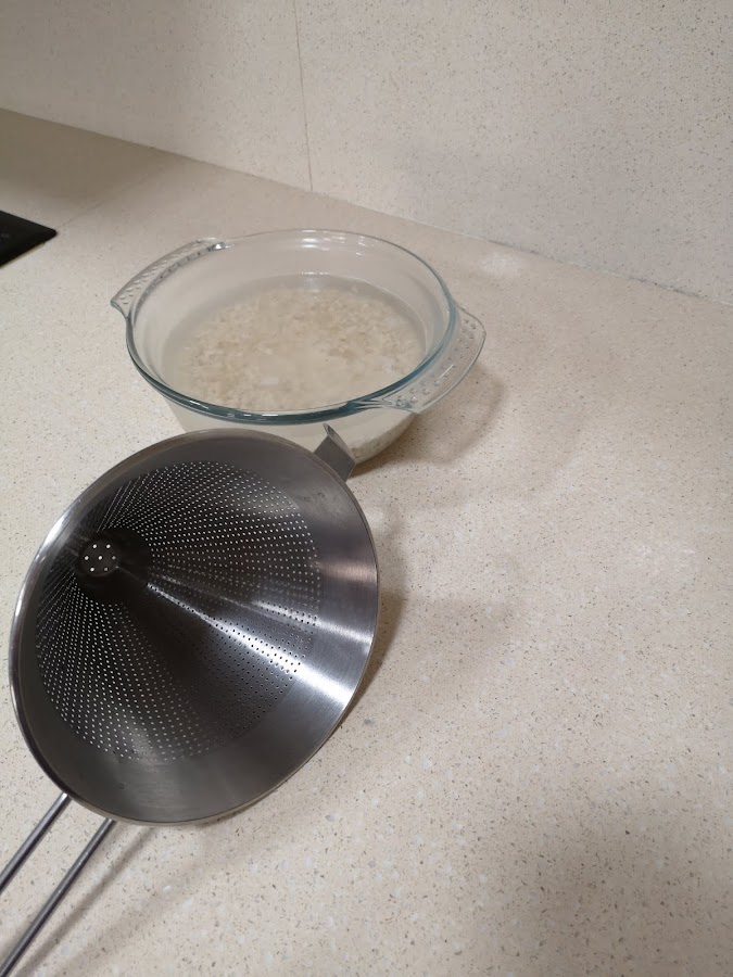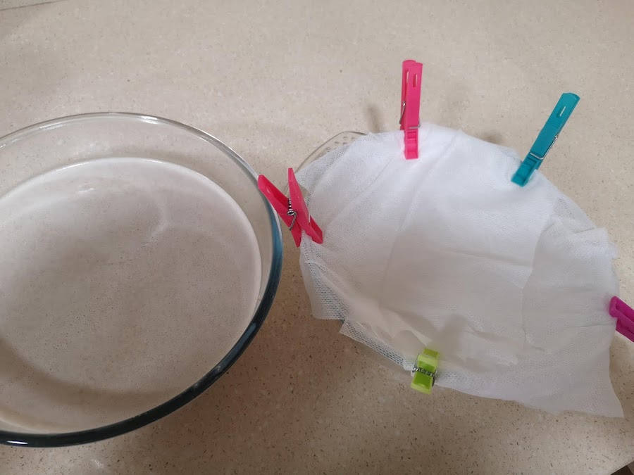 Lo colais es un colador como hice yo y después en una "malla casera" que me invente con gasa estéril y pinzas (ya que no encuentro por ningún lado bolsas para leches vegetales)