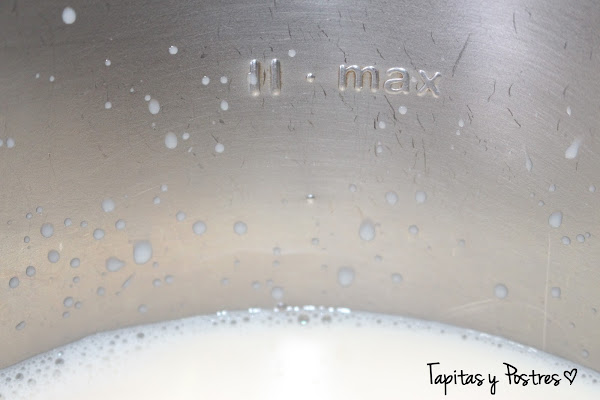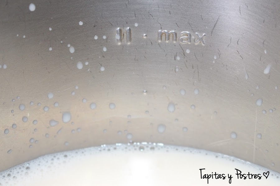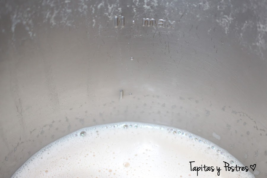 Fijaros en la marca. Al acabar debe notarse menos liquido. Esto lo hago así como comprobación, ya que la leche de avena no es blanca del todo y la prueba del cambio de color aquí es inapreciable por lo que debemos fiarnos del resultado final en volumen.