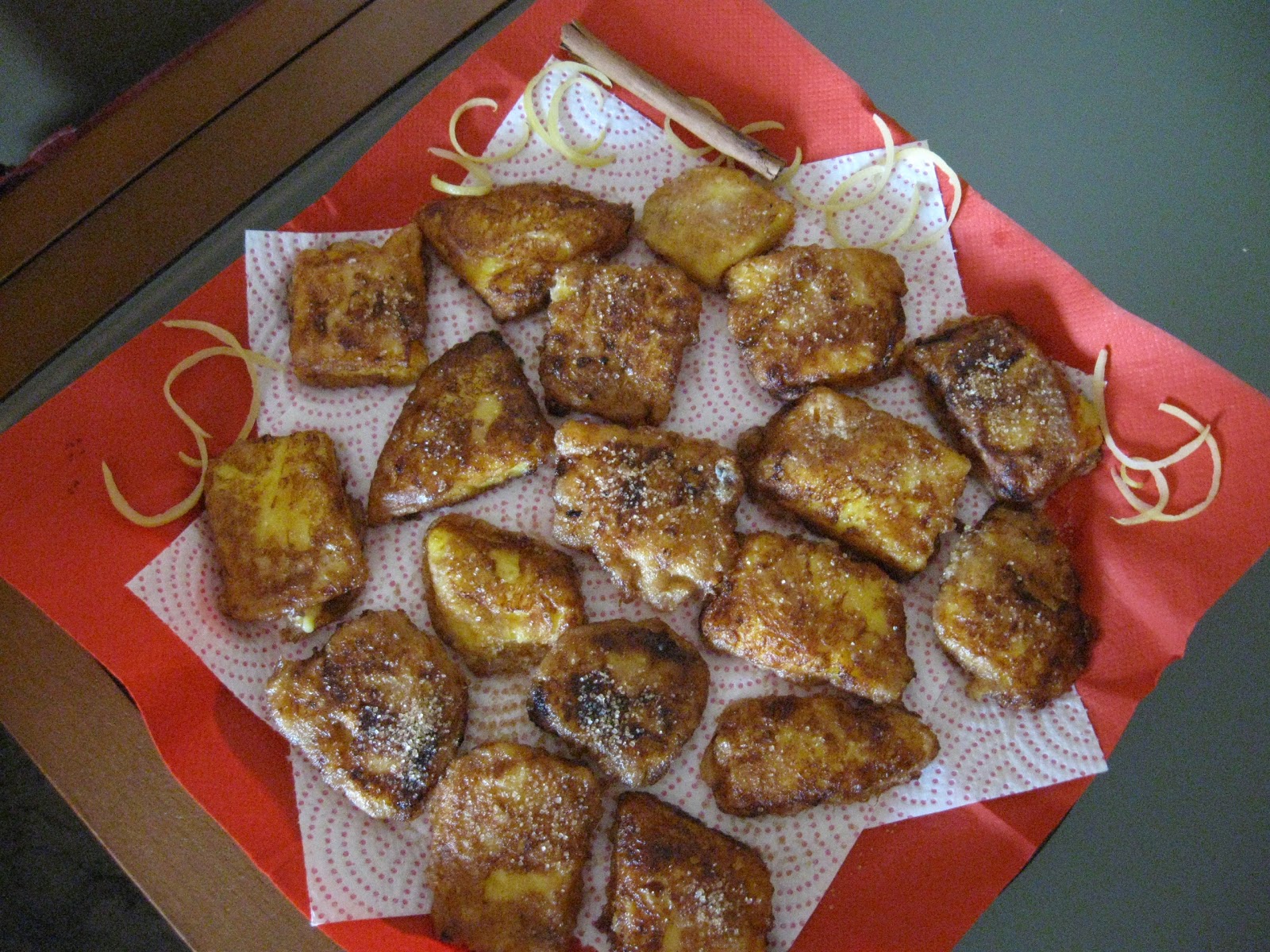 Dejamos enfriar en una fuente plana. Cuando la crema esté bien cuajada, la cortamos en trozos, la rebozamos con harina, canela y huevo y la freímos en aceite bien caliente.