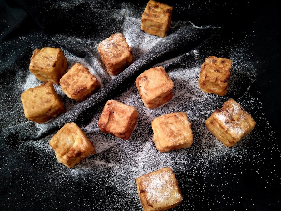 Cortamos la masa en porciones, o si lo hacemos en moldes individuales simplemente desmoldamos. Para freír pasamos por harina y huevo. Una vez frita la dejamos sobre papel absorbente para que no nos quede grasienta y cuando queramos servirla espolvoreamos azúcar por encima.
